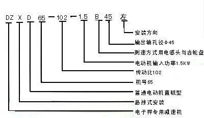 型號 | 電機功率 | 減速比 | 安裝方式 | 測速方式 | 處軸孔徑 | 安裝方向 |